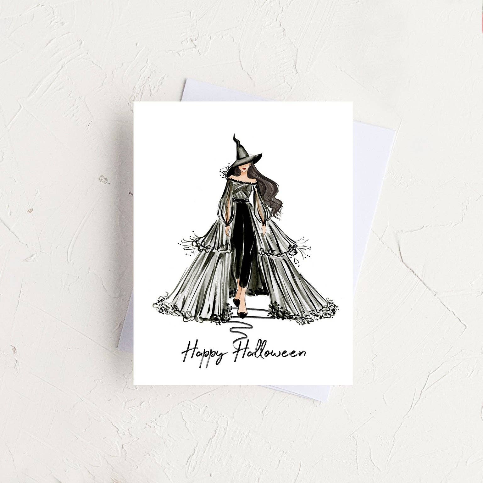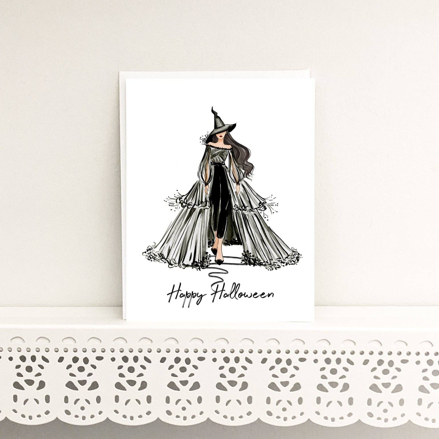 The idea that witches have to be haggard and hunched over a cauldron is just outright outdated, celebrate late October with our spell binding catwalk femme. Our hand illustration brings all the fun of Halloween by combining the worlds of couture and witchcraft. With a flowing black cape that’s fit for any runway, our figure struts confidently into the 31st, casting aside all ideas that witches shouldn’t be glamorous. Wish somebody who adores all that is chic a happy halloween!