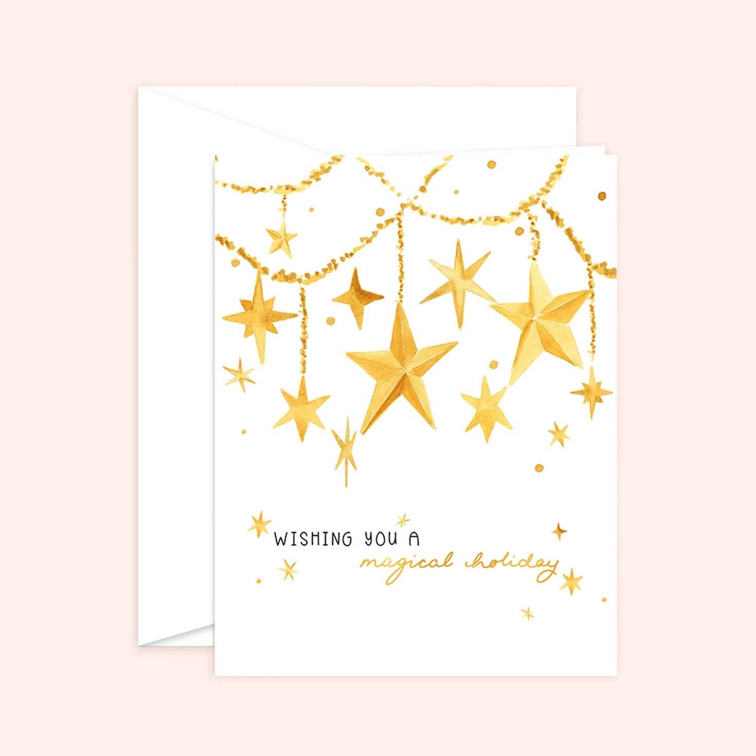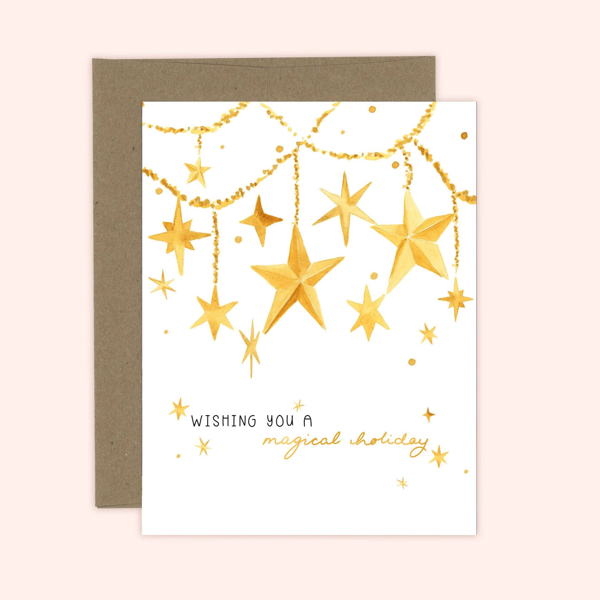Send a little stardust this season with a magical holiday card featuring delicate watercolor twinkling stars. The soft, celestial design pairs perfectly with the heartfelt message, “Wishing You a Magical Holiday,” creating a sense of wonder and warmth.