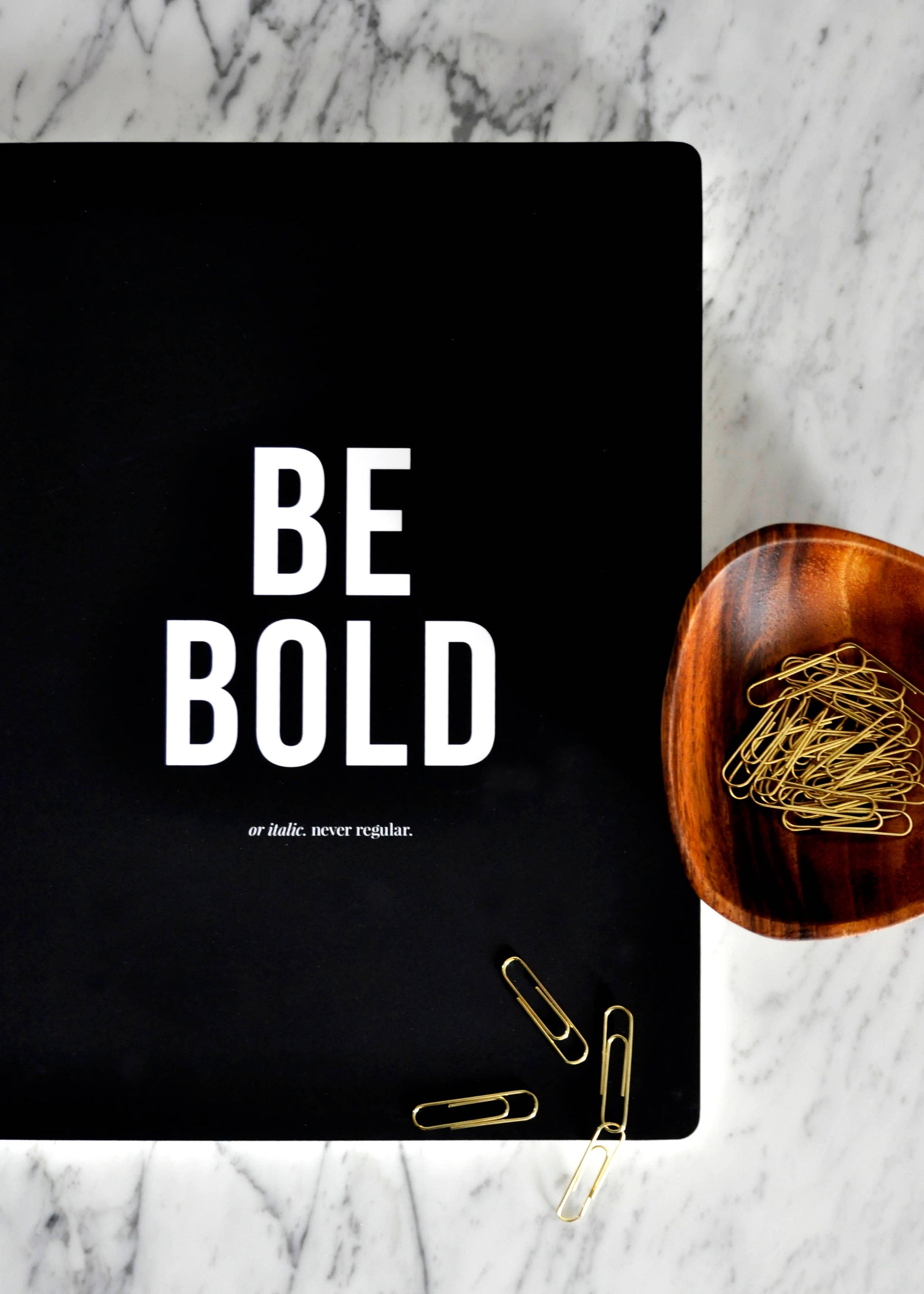 Be bold. Or italic. Never regular. A good reminder to inspire you to be you. This velvety journal is hand-bound with a rich black cover. Inside you’ll find 48 smooth, cream pages with a dot grid just waiting to be filled with your bold ideas (70 lb. stock). USE IT At home or work. Wherever you have bold ideas. DIMENSIONS Notebook measures 7.25 in. x 10 in. x 0.25 in.