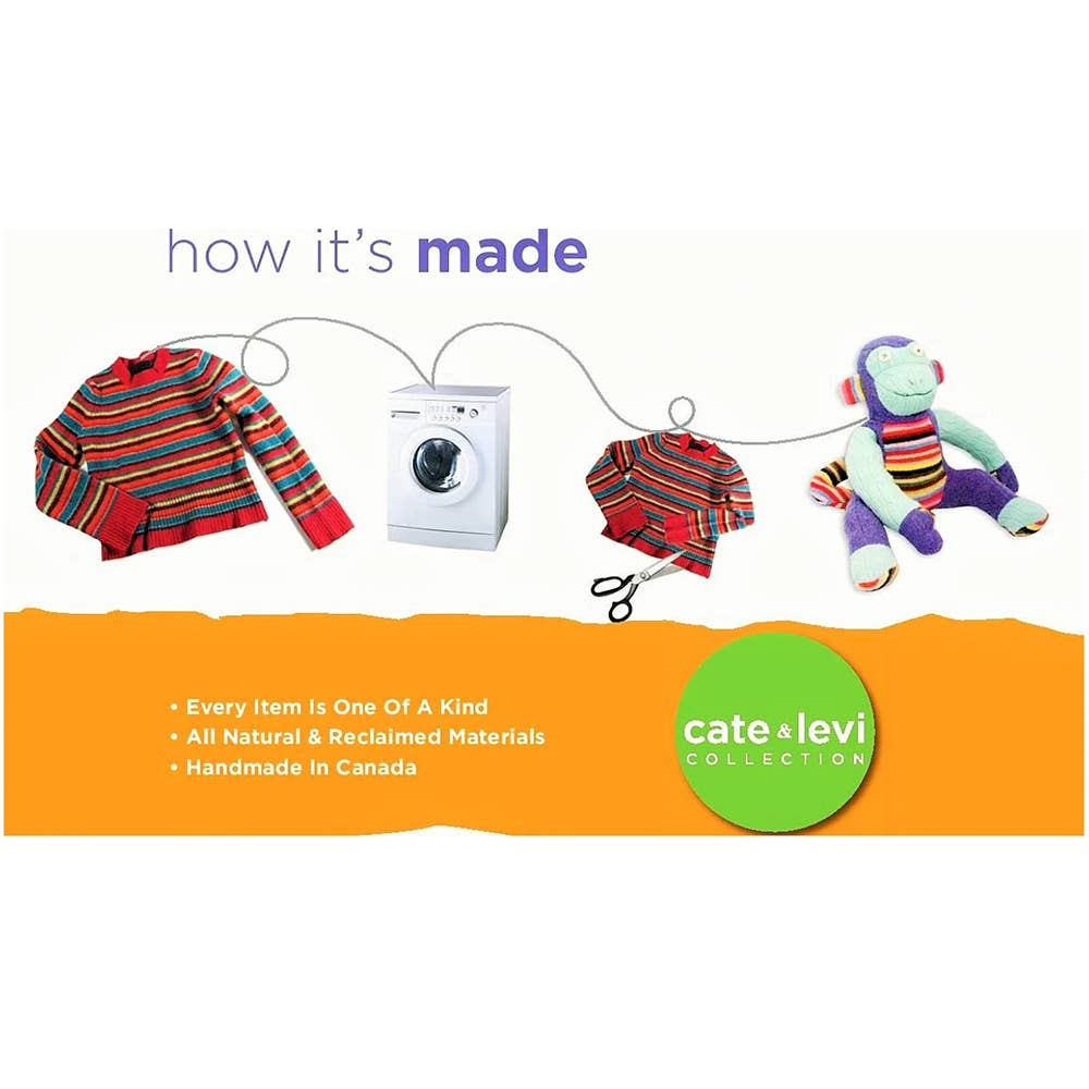 Each puppet is made from reclaimed sweaters whose colours and textures are individually selected. Not only is this process environmentally responsible, it ensures each toy is one of a kind! Colours and patterns will vary.