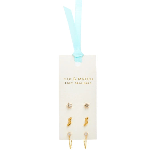 This stud earring set is inspired by the late David Bowie, the ultimate superstar also known as Ziggy Stardust. The set of three pairs of earrings are sparkling stars, zigzag studs and rhinestone posts with dainty chain hoops, the perfect mix and match earrings for countless combinations. The stud earring set is available in 14 karat gold or silver and is mounted on a simple display card complete with colourful ribbon, ready for instore display. Additional shapes are available in the Mix and Match earrings collection, each paying homage to incredible artists in a simple and stylish way. Bowie Mix & Match Earrings Features: Made of fine pewter Available in Gold and Silver Size: 0.12” x 0.04” Collection: Mix and Match Earrings