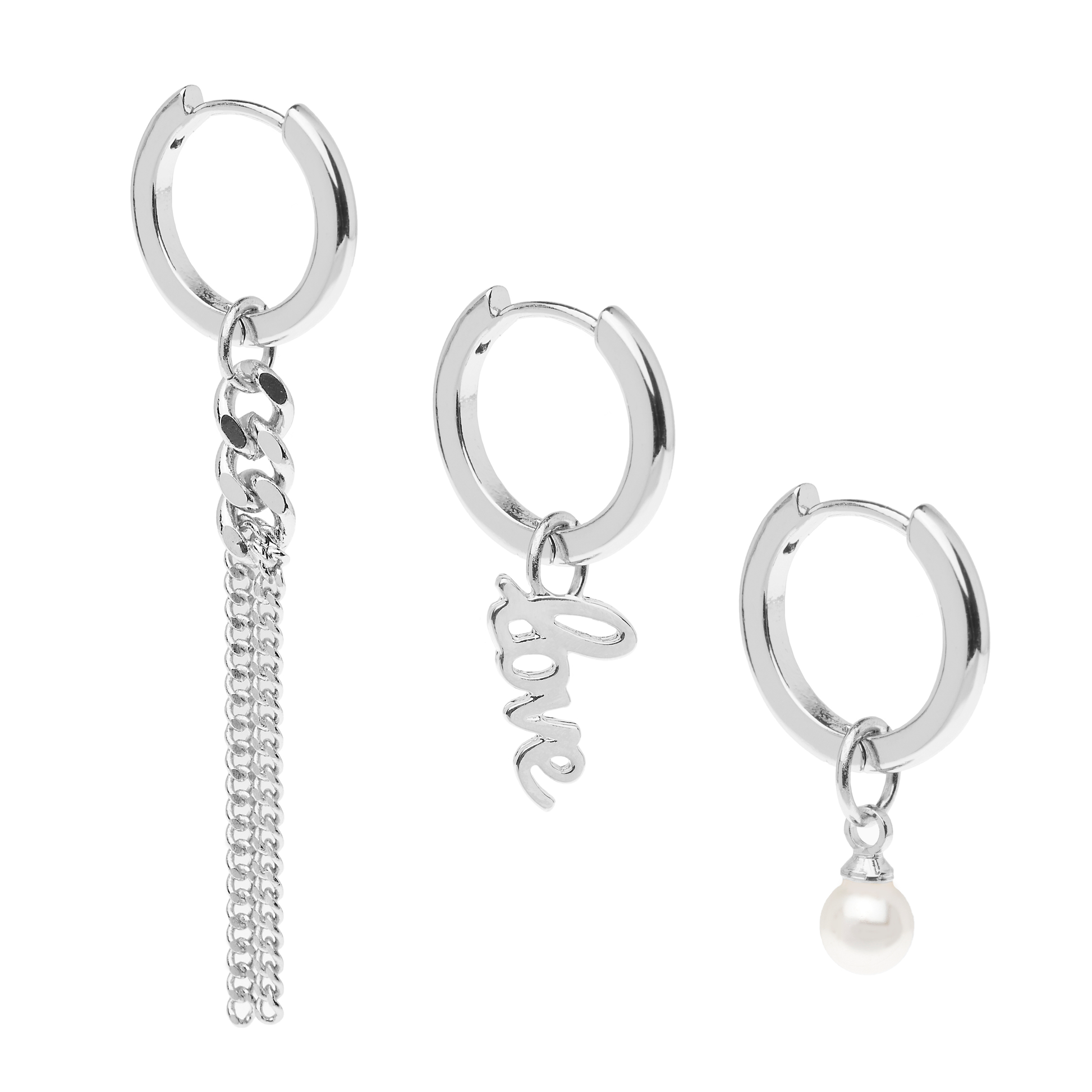 These interchangeable charms give so a fun opportunity to make a statement. Each hoop comes with 3 charms including a ‘love’ charm, chain dangle and a glass pearl. You can choose to layer them together as a set on the hoops, or select different combinations for up to 6 unique looks.